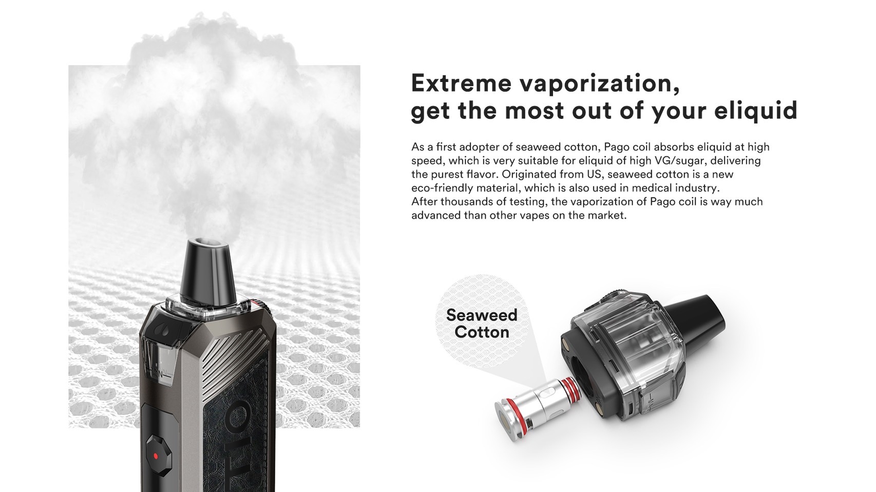 1.Pago線圈首次採用海藻棉,吸液速度快,非常適合高VG/PG的液體,口感最純正。