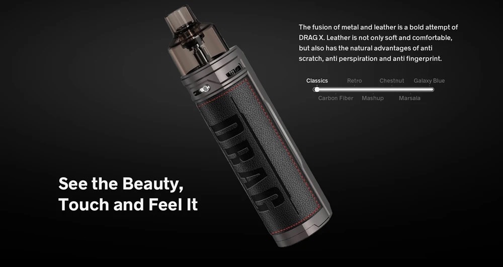 DRAG最經典的標誌就是極速秒吸,DRAG X延續了這一血統。全新 GENE.TT 芯片提供 0.001 秒的點火速度和高達 80W 的強大輸出,以及開創性的皮革工藝。