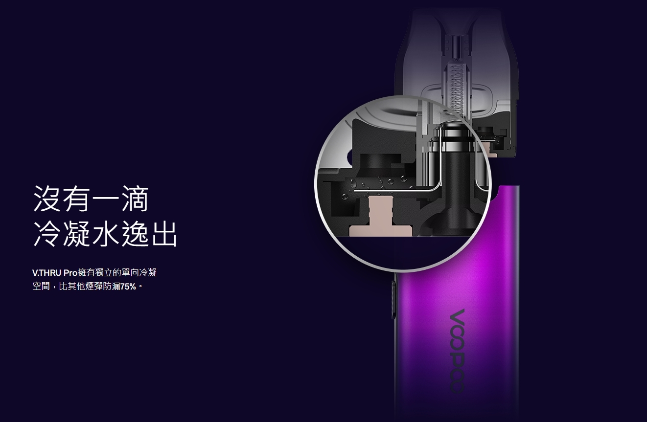 磁吸+卡扣 超級簡單的凹槽扣沒有一滴 冷凝水逸出V.THRU Pro擁有獨立的單向冷凝空間,比其他煙彈防漏75%。